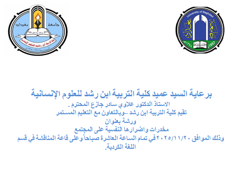 أقام قسم اللغة الكردية في كلية التربية ابن رشد للعلوم الانسانية بجامعة بغداد, ورشة تدريبية حول “المخدرات واضرارها النفسية على المجتمع”, القاها: أ.د مهاباد عبد الكريم أحمد, وحضرها عدد من طلبة الكلية وتدريسيها وموظفيها. قسمت الورشة الى عدة محاور, تناول المحور الاول منها تعريف المخدرات وأسباب انتشار تعاطي المخدرات بين الشباب, فيما تناول المحور الثاني الاضرار النفسية والاجتماعية للمخدرات, في حين جاء المحور الاخير حول طرق وقاية الشباب من أفة المخدرات, كما وتناولت الورشة جانب من اهم الاثار السلبية التي تنعكس على الفرد والمجتمع ولاسيما بين صفوف الشباب في مراحل الدراسة بما فيها مرحلة البكالوريوس ومرحلة الماجستير مما تسبب الموت البطيء لهذه الفئة ودمار لمستقبلهم وعوائلهم وتضمنت الورشة اهم المخاطر التي تعصف بفئة الشباب وتمثلت بصور لبعض أنواع المخدرات وتصنيفاتها وكذلك تضمنت اهم الاضرار النفسية التي تخلفها على الفرد والمجتمع. وهدفت الورشة الى تعريف الطلبة بأنواع المخدرات الشائعة وخطورتها, و شرح الاضرار النفسية الناتجة عن التعاطي مثل: القلق ، الاكتئاب ، الهلاوس ، اضطرابات الشخصية ، وضعف الادراك, فضلا عن إعطاء صورة عن العوامل المؤدية للتعاطي مثل الضغط النفسي ، ورفقاء السوء . وخرجت الورشة بعدد من النتائج واهمها: اكتساب الطلبة سلوكيات وقائية وطرق عملية لرفض التعاطي والتعامل مع ضغط الاقران, وزيادة فهم الطلبة للعلاقة بين الصحة النفسية والادمان, وتعزيز روح المسؤولية المجتمعية للحد من انتشار التعاطي, كما وأوصى المحاضرون بضرورة استمرار تنفيذ ورش وبرامج توعوية دورية لطلاب المدارس والجامعات وافراد المجتمع, و تعزيز دور وسائل الاعلام في نشر رسائل وقائية تسلط الضوء على المخاطر النفسية للمخدرات.