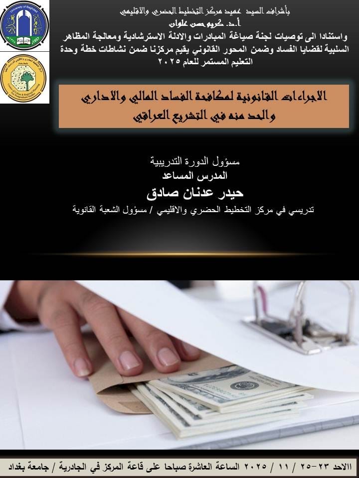 دورة تدريبية ينظمها مركز التخطيط الحضري والاقليمي للدراسات العليا يلقيها مسؤول الشعبة القانونية المدرس المساعد حيدر عدنان صادق