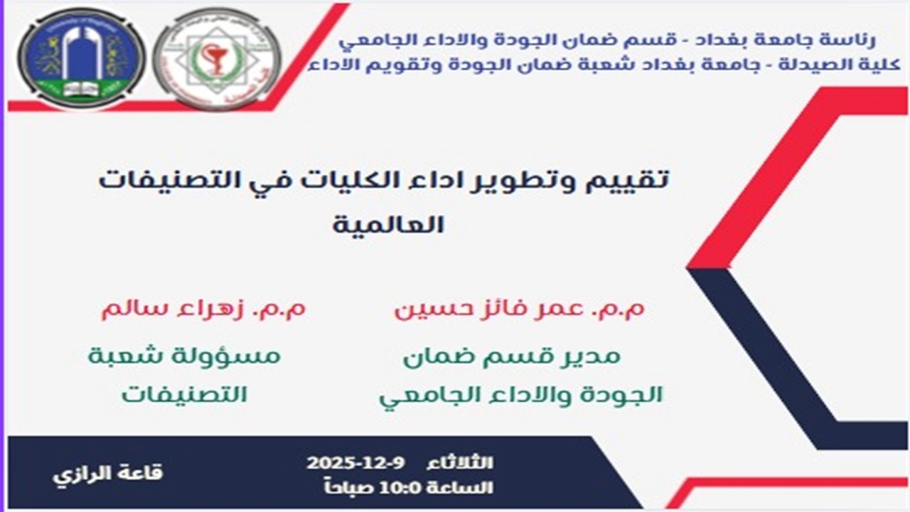 ورشة تدريبية تقيمها رئاسة جامعة بغداد - قسم ضمان الجودة والاداء الجامعي كلية الصيدلة - جامعة بغداد شعبة ضمان الجودة وتقويم الاداء