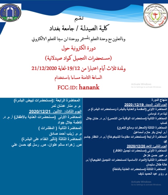 اهداف الدورة كانت التعريف بمواد التجميل الشائعة الاستخدام ( مكوناتها، طرق استخدامها، انسب نوع لكل شخص) حيث إن اغلب مواد التجميل تعتبر أدوية حسب تعريف منظمة الصحة العالمية لكنها تصرف من قبل الصيدلي دون الرجوع للطبيب و الناس الأصحاء و المرضى يطلبون نصيحة الصيدلي عن انسب الأنواع و طريقة الاستخدام .
