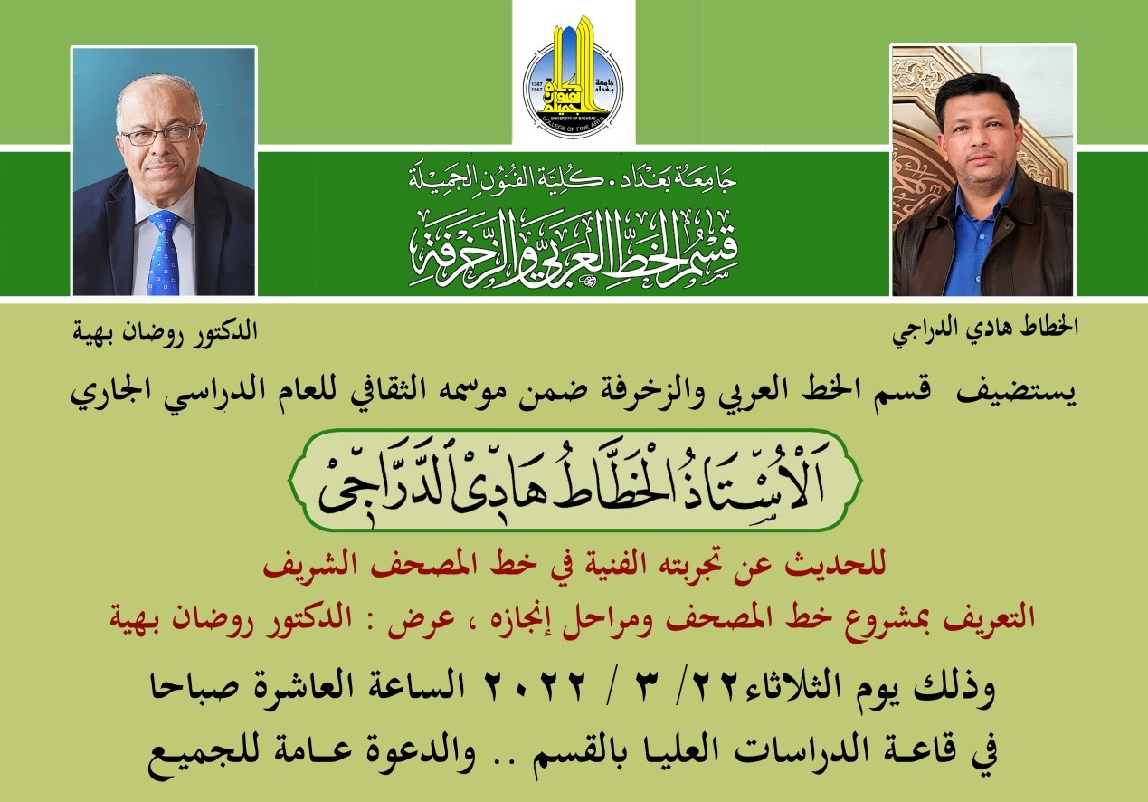 استضاف قسم الخط العربي والزخرفة بكلية الفنون الجميلة / جامعة بغداد ضمن موسمه الثقافي للعام الدراسي الجاري 2021/ 2022 الآستاذ الخطاط هادي الدراجي ، وذلك يوم الثلاثاء 22 / 3 / 2022 على قاعة الدراسات العليا في القسم ، وقد أدار اللقاء وقدم له الأستاذ الدكتور عبدالرضا بهية ، وبحضور ومشاركة الأستاذ المساعد الدكتور فرات جمال العتابي رئيس القسم ، وجمع من تدريسيي القسم وطلبته وعدد من الضيوف من خارج الكلية .