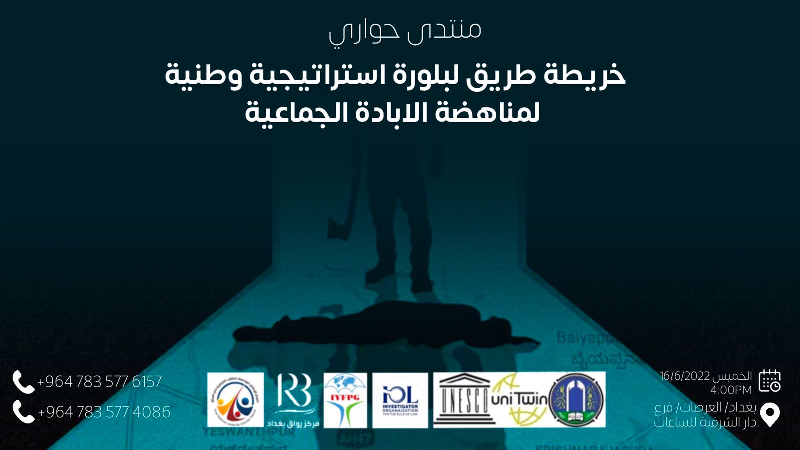 يعقد منتدى حوراي في مركز رواق بغداد حول خريطة طريق لبلورة استراتيجية وطنية لمناهضة الابادة الجماعية بمشاركة كرسي اليونسكو لدراسات منع الابادة الجماعية في العالم الاسلامي في كلية الاداب جامعة بغداد يشارك في الحوار أستاذ الكرسي صلاح الجابري في محاضرة بعنوان استرتيجية كرسي اليونسكو لمواجهة الابادة الجماعية ومنعها ومعالجة آثارها.. الساعة الرابعة عصراً من يوم الخميس الموافق ١٦/ ٦/ ٢٠٢٢