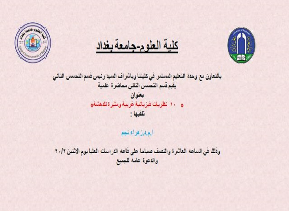سنتناول في هذه المحاضرة 10 أفكار فيزيائية مثيرة للدهشة منها ما هو نظريات شهيرة أغلبنا سمع عنها ومنها ما هو فرضيات بُنيت عليها نظريات، ومنها ما هو نتائج علمية توصل إليها العلماء بفضل النظريات والأبحاث التي كانت ومازالت هذه الأفكار محط جدل وحيرة بين العلماء