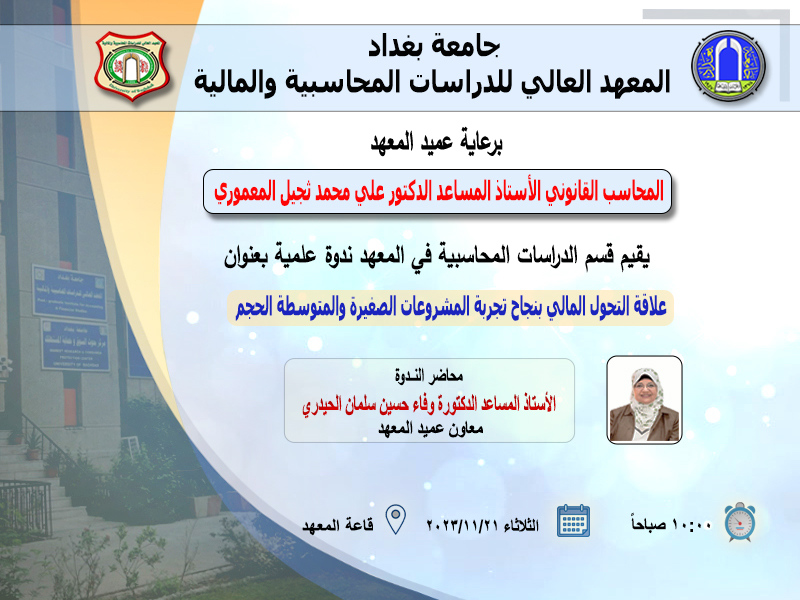 ندوة علمية في المعهد بعنوان (علاقة التحول المالي بنجاح تجربة المشروعات الصغيرة والمتوسطة الحجم) يحاضر فيها أ.م.د. وفاء حسين سلمان